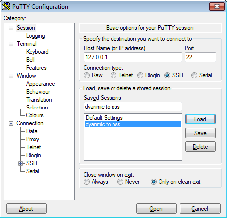 Please note that you’ll need to leave the other Proxy addresses and ports empty (or pointing to a different address/port) in order for the dynamic port forwarding to work.